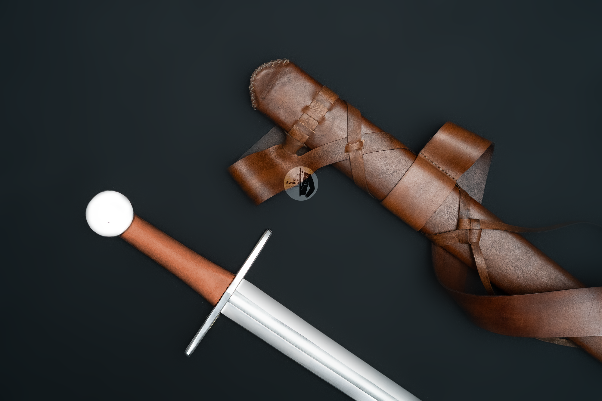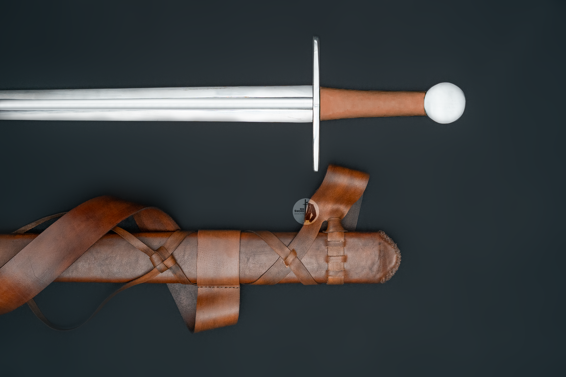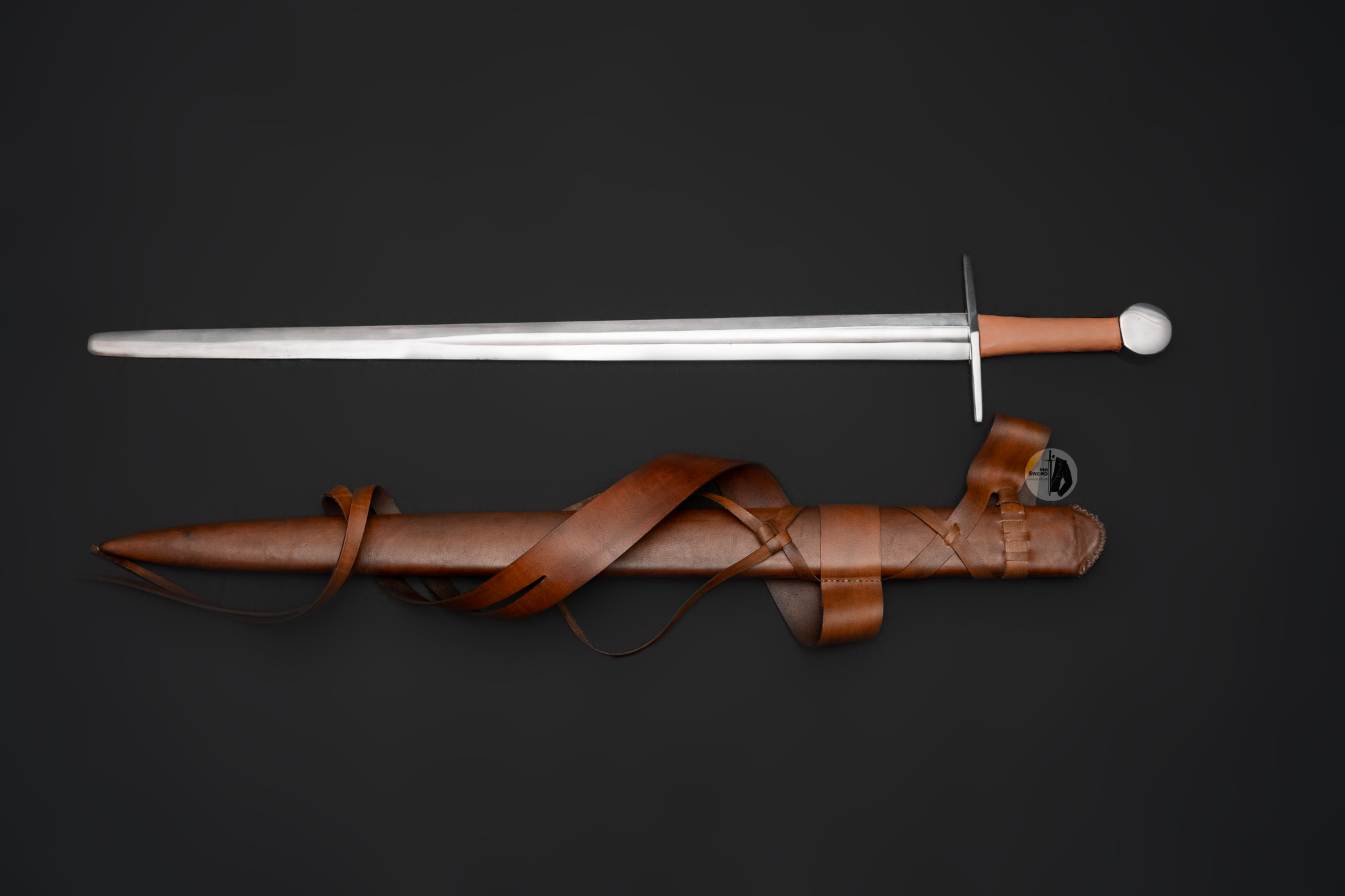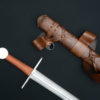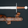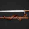 Universal sword for training, fighting and historical reenactments. Made of 50HF high-carbon spring steel. Handle made of ash wood covered with leather. The set includes a custom-made scabbard, also made of ash and covered with leather. The belt is tied with a “dragon’s tongue”.